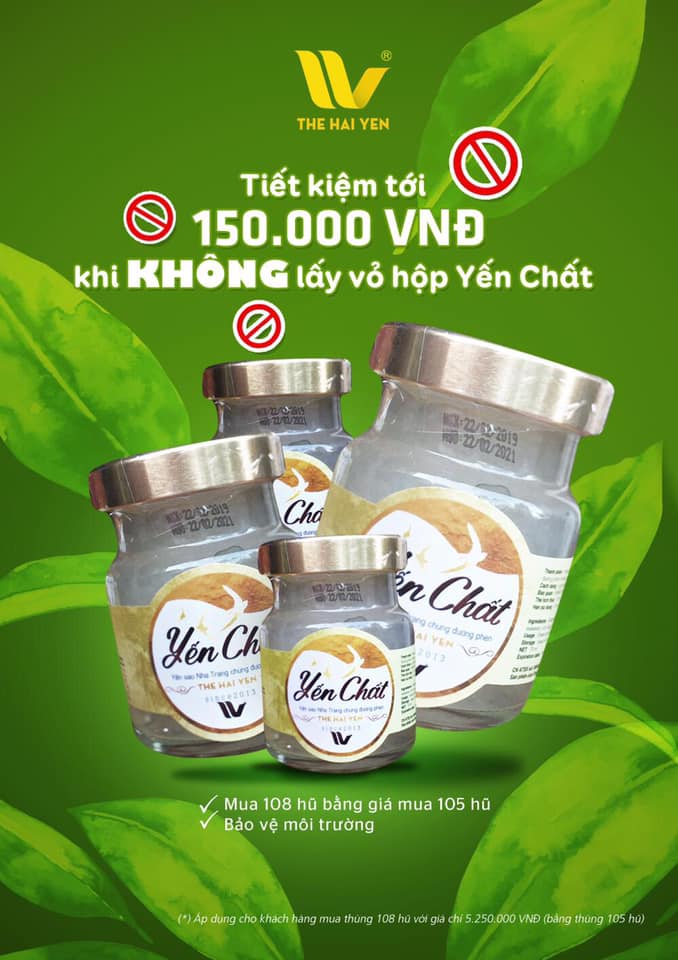 Nhằm giảm thiểu lượng rác thải ra môi trường, The Hai Yen khuyến khích khách hàng không lấy vỏ hộp Yến Chất nếu không cần dùng đến bằng việc tặng ngay 150.000 đồng cho mỗi thùng 108 hũ Yến Chất
